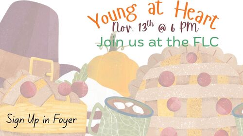 The upcoming Young at Heart in November will be on the 13th at 6:00 PM at the Family Life Center. This will be an area wide so grab your friends and come join us.